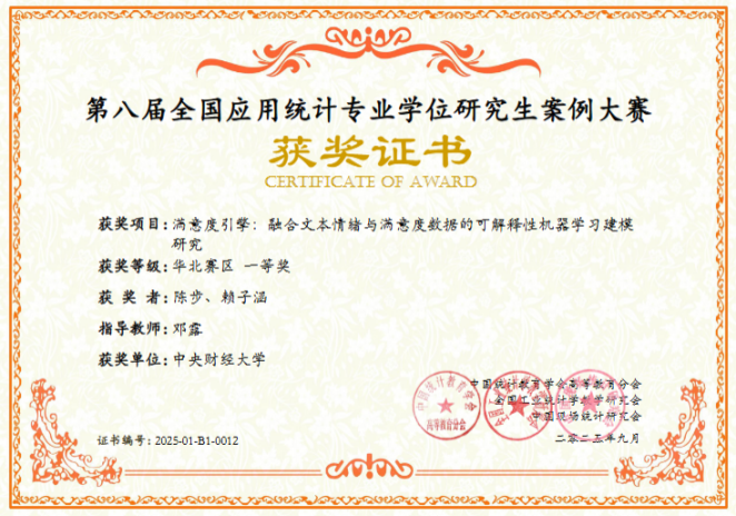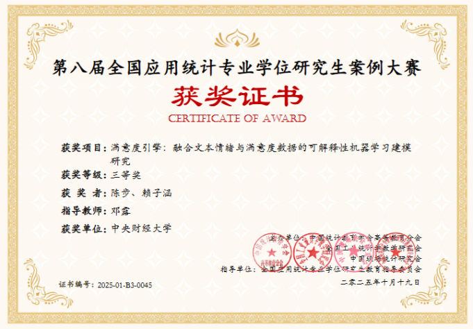 此次学院获奖案例紧扣行业痛点,展现出鲜明的实践价值与创新特色。其中,由研究生团队提交、邓露教授指导的《满意度引擎:融合文本情绪与满意度数据的可解释性机器学习建模研究》案例,先获区域赛一等奖,后在全国总决赛中,获得全国三等奖;由刘苗副教授指导的《融合非结构化文本信息和ESG评级的企业信用风险预警—以A股上市公司为例》案例,获区域赛二等奖;由杨玥含教授指导的《数智驱动下汽车满意度评估:基于多模态数据融合的建模与评价机制优化》案例,获区域赛三等奖。三支团队从消费满意度评估、企业风险预警等领域切入,通过创新统计方法解决实际问题,充分体现学院研究生的跨领域实践能力与创新思维。