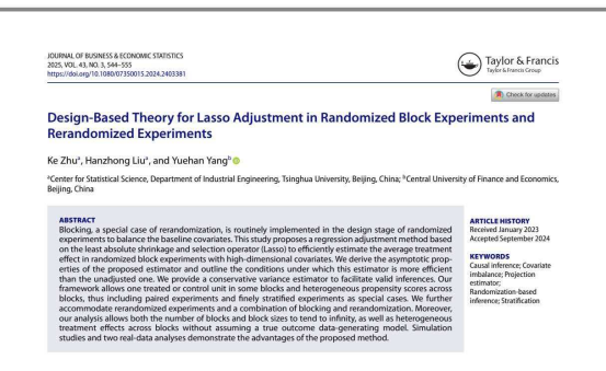 杨玥含教授在我校外文AAA类期刊Journal of Business & Economic Statistics发表因果推断协变量调整论文。本研究针对高维协变量设置下的随机区组实验与再随机化实验,提出了一种基于Lasso的回归调整方法,用于提高处理效应估计的效率,并构建了相应的设计基础理论。在理论方面,文章在有限总体框架下推导了所提估计量的一致性、渐近正态性及其保守方差估计方法,证明了其在存在区组内倾向得分异质性与区组大小变化时,依然优于未经调整的估计方法。所提方法不要求每个区组内同时存在多个处理和对照单位,因而适用于成对实验、细致分层实验和使用全匹配的观察性研究。此外,研究进一步扩展到“区组+再随机化”联合设计,提出了相应的Lasso调整估计及其推断理论,揭示其在有限样本中具有更低均方误差的优势。数值模拟和两个真实数据分析验证了方法的有效性和适用性。该成果不仅填补了高维设定下再随机化设计调整的理论空白,也为复杂实验设计中的协变量不平衡问题提供了实用且高效的处理方案,具有良好的学术影响和现实推广价值。